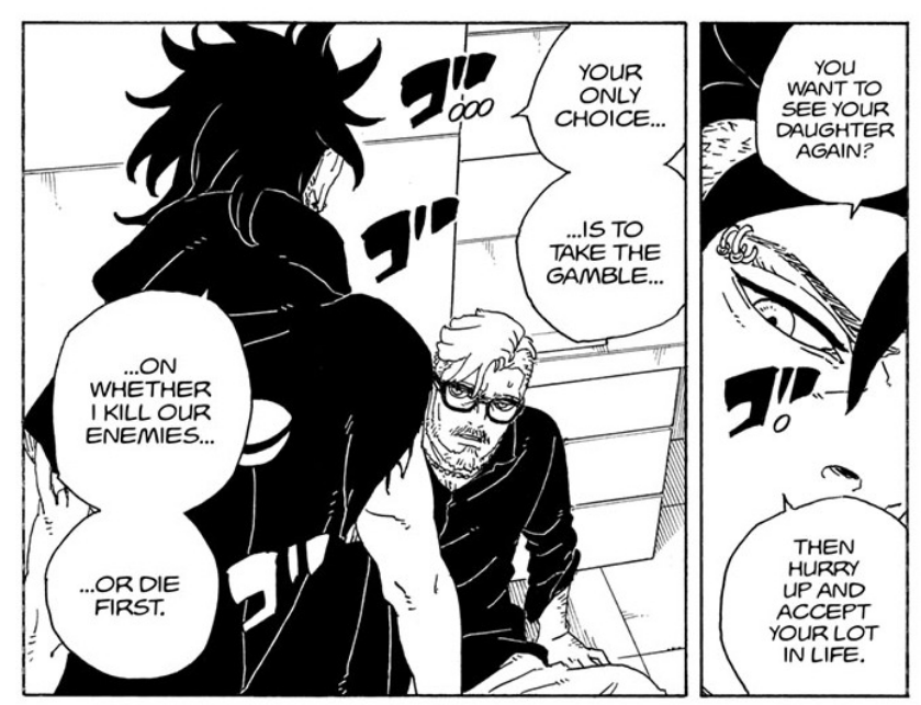 I'm not sure if this is actually Boruto's intent. At the end of NNG, he declared that he wouldn't let their conflict devolve into brother killing brother, and I don't think he plans to have his parents return to a world in which Kawaki has killed him, regardless of whether he's nothing but a flesh suit for Momoshiki. But the fact remains, both of them are making dangerous deals for power, taking them beyond the level of mere humans to keep the planet safe.