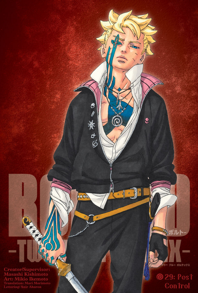 I must admit, I was a bit of a skeptic of the too-many-Borutos approach to chapter covers, but I'm starting to see the vision. (Yes, I know he's the fucking mc, and he's going to appear a lot. Lay off.) We're presented with the evolution of Boruto in Two Blue Vortex, his development or his descent, depending on how you view the story's progress. We can track the addition of the pin representing Kawaki (either the word brother or a taiyaki treat) that appears after their alliance, we track the changes in his master's sword after Sumire's upgrade. In recent covers, he's shed his cape, the scar where his human heart once was exposed more and more.