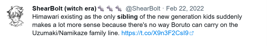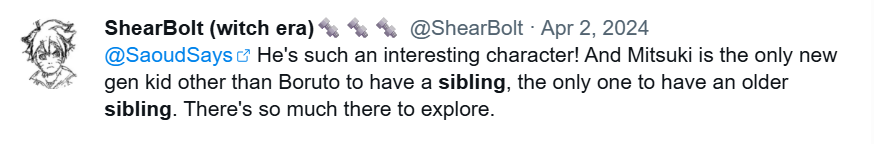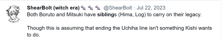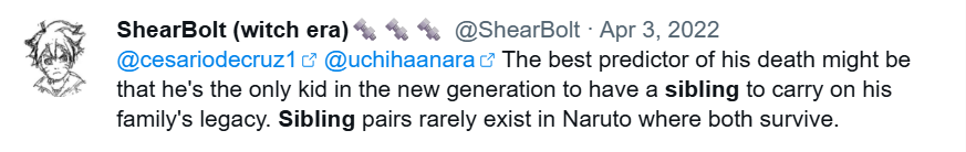 Dusting off ye olde Twitter archive, I've been on the sibling subject for a while now—with good reason. There are very few sibling pairs in the new generation—Hima and Boruto, Mitsuki and Log, and Eida and Daemon. Returning to Naruto for a moment, Hinata and Hanabi, the Sand family, and Kiba and Hana some rare cases in which all siblings survive to adulthood. The plot is littered with lost siblings: Tsunade and Nawaki, Sasuke and Itachi, Madara and Izuna, Hashirama and Tobirama surviving Kawarama and Itama. Adoptive pairings of "brothers" are as common than seeing two living siblings together, be it the Raikage and Killer Bee, Naruto and Sasuke, Sai and Shin (a case where Shin died as well).