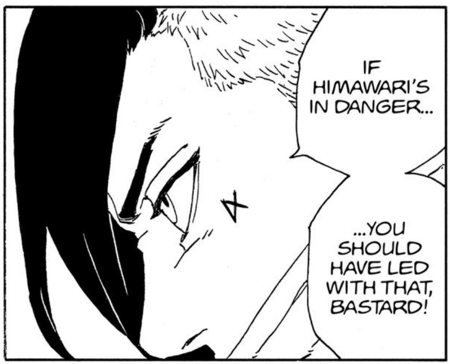 Both brothers have been depicted as being protective of Himawari, some of the first true bursts of emotional sentiment expressed by each of them over her wellbeing. Simultaneously, both have rejected the role of being her "big bro," Boruto due to her perception of the world through Omnipotence and Kawaki... Okay, let's just say we don't get a lot of emotional clarity from Kawaki. Through one lens, his rejection of the name could be read as the only vestige of guilt he has over taking her family away. Through another, he could simply hate being called Boruto's name. I think it's the prior, but I'm not going to reject reads of the latter.