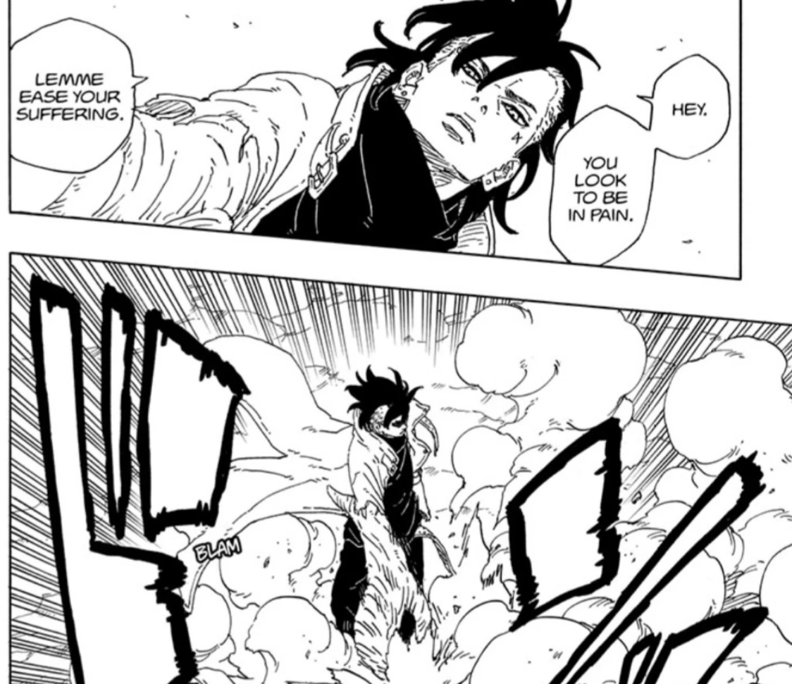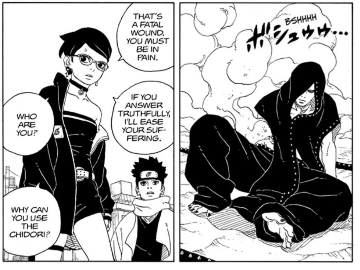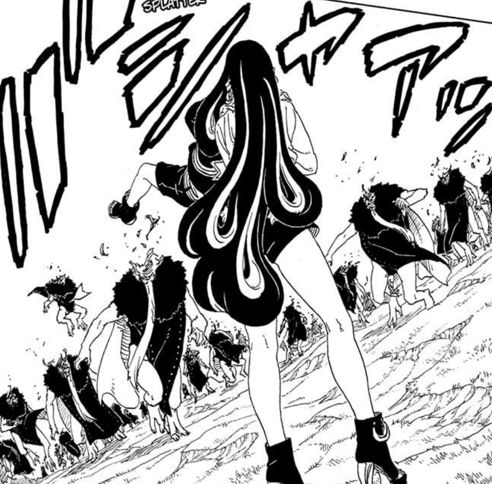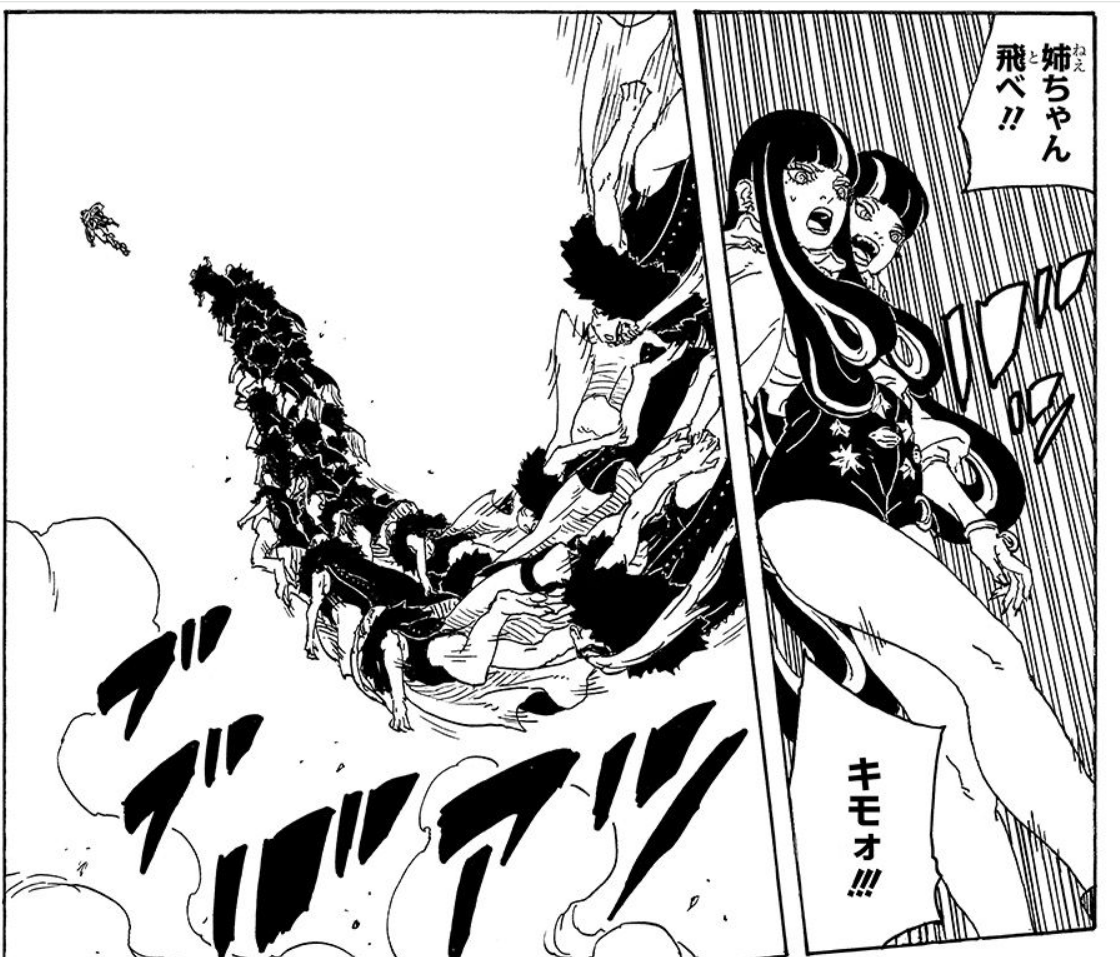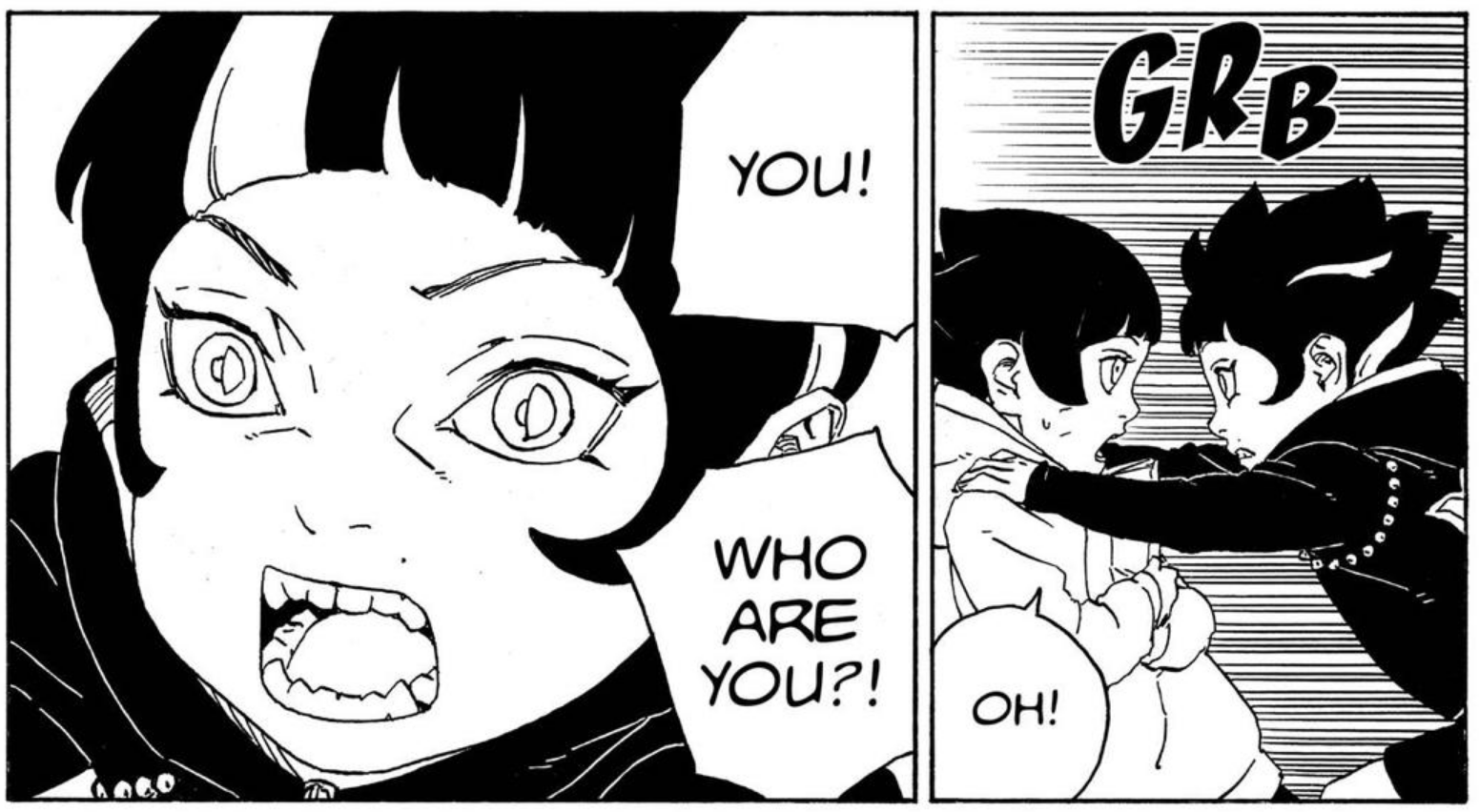 In Himawari's view of the world, Kawaki is Boruto, her true big brother, and Boruto is Kawaki, the adopted brother who lived in her household, once saved her life, and is accused of killing her parents. Because of Omnipotence, it's hard to talk about each one individually when viewing them through her eyes. As the chapter closes, her big brother has overheated on the battlefield and is under attack by Mamushi while her adopted brother is caring for Sarada.