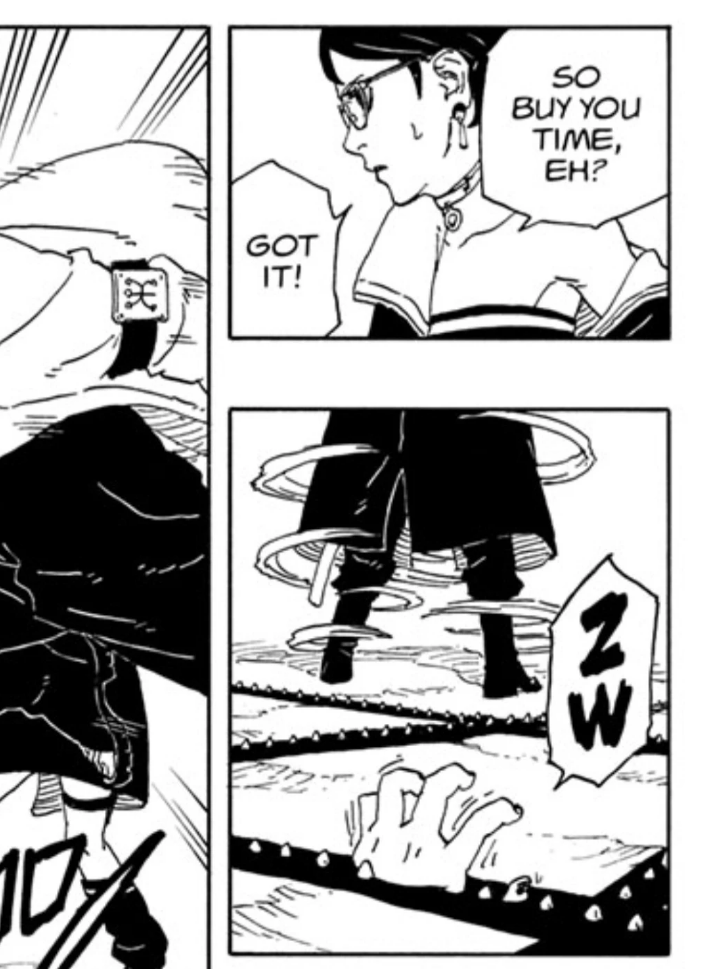 This is not to say that Kawaki and Sarada are written to be the same character. Rather, that they're opposite ends of the same spectrum on an axis related to Boruto. For example, let's look at the first parallel above, Boruto asking both of them to buy him time to perform a jutsu. While this is teamwork, it's also reinforcing the underlying insecurity of both characters that they're not strong enough. Boruto is telling both of them to be a distraction while he does the real work instead of them taking center stage. In traditional teamwork dynamics, this is a strategy that could work well, but Boruto and the other characters haven't been functioning as a cohesive team for a while. Instead, Boruto's request reinforces the idea that neither Sarada nor Kawaki are strong enough and haven't progressed as far in their training as he has. In my opinion, this is what sets the stage for the events in chapter 32 where both are so eager to use their new abilities without having them tested beforehand that it leads to disaster.