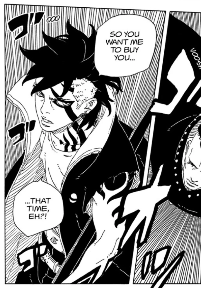 If you recall in my chapter 32 review, I pointed out that both Kawaki and Sarada respond to Shikamaru's battle plans with overestimations of their own strength, one panel stacked atop the other. It seemed like a direct parallel between their characters, one overestimating his scientific ninja tool abilities, the other overestimating her doujutsu abilities. Briefly skimming over some earlier TBV chapters led me to finding two other places where their words and actions align.