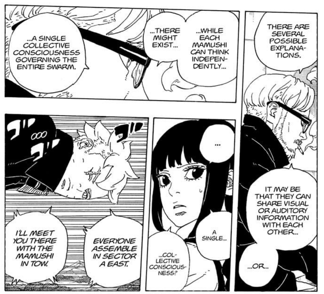 A brief reread of the chapter before writing this caused me to realize something: Amado posits two theories to Sumire as to why the Mamushi hoard travels as one after Boruto lures them with the promise of Eida: either they share eyesight and vision or, while thinking independently, "a single collective consciousness govern[s] the entire swarm."