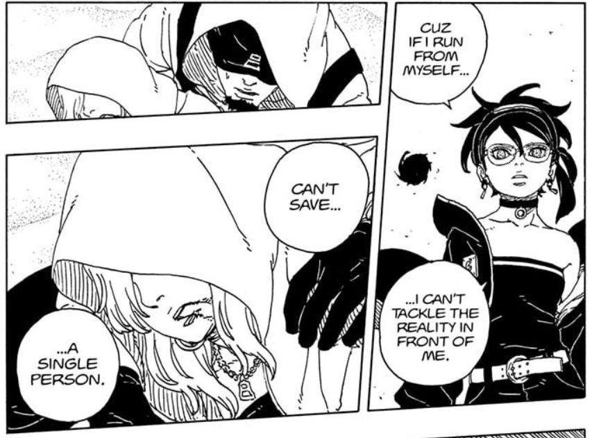 In Yodo's final moments, she says she can now hear Sarada's inner turmoil, telling her it's okay if she awoke her Mangekyo Sharingan (MS) for the love of one person rather than for the benefit of everyone. She tells her not to hold back anymore, to stop suppressing that power inside her. This leads to Sarada reawakening her MS, acknowledging her feelings and powers. As she says: "Cuz if I run away from myself, I can't tackle the reality in front of me. Can't save a single person."